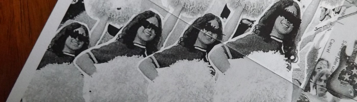 These zines are, as I said, very small, though creatively laid out to hold a good amount of content on their single, 8.5″ x 11″ sheet. Once unfolded, one side of each zine contains a collage of clever, themed artwork, while the other side, once refolded, holds the text of each zine. Pay attention to how it unfolds, because I proved to be about as competent at folding these back into the correct page order as the patrons at the library where I work are at reassembling the newspapers when they’re done with them (hint: they’re really bad at reassembling the newspapers when they’re done with them).