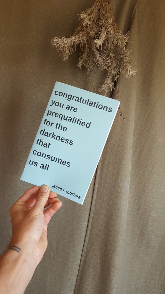 Jamie Mortara’s poetry zine congratulations you are prequalified for the darkness that consumes us all is a stream of consciousness shoulder shrug seeking to encapsulate the crippling awkwardness and self-doubt and overwhelming desire for love and belonging that war in the poet’s mind. These pages show a poet who wants to claw off their own skin while at the same time wants to be held close while wearing that skin.