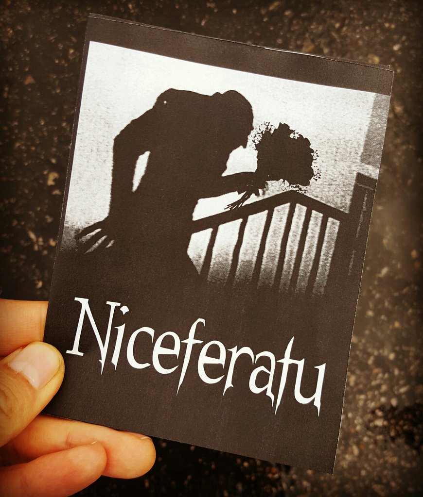 The zine is 1/4 size and well-printed on glossy paper. The film is black and white, so naturally the zine is as well. It features screenshots from the film (directed by the great F.W. Murnau and starring Max Schreck) that have been modified to appear as if the titular vampire is just trying to be nice. In one shot, he’s carrying a grocery bag, and the caption reads, “I brought snacks!”